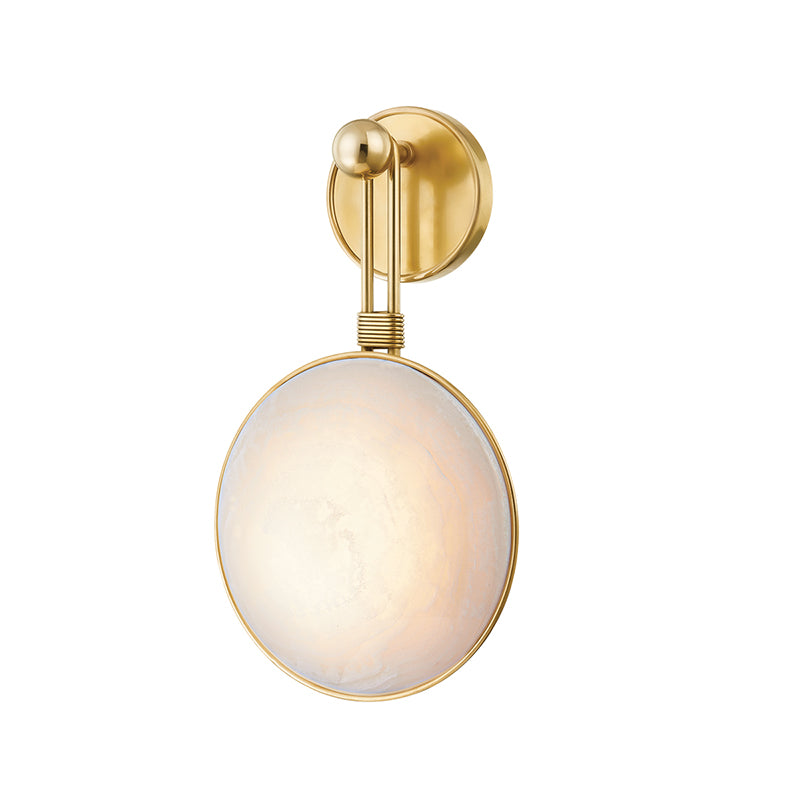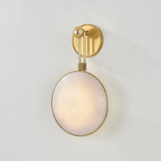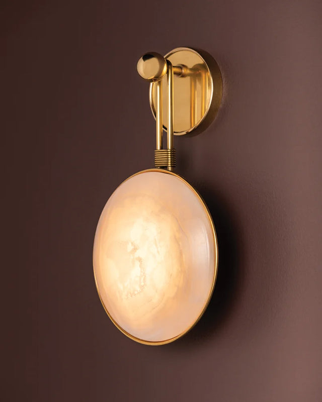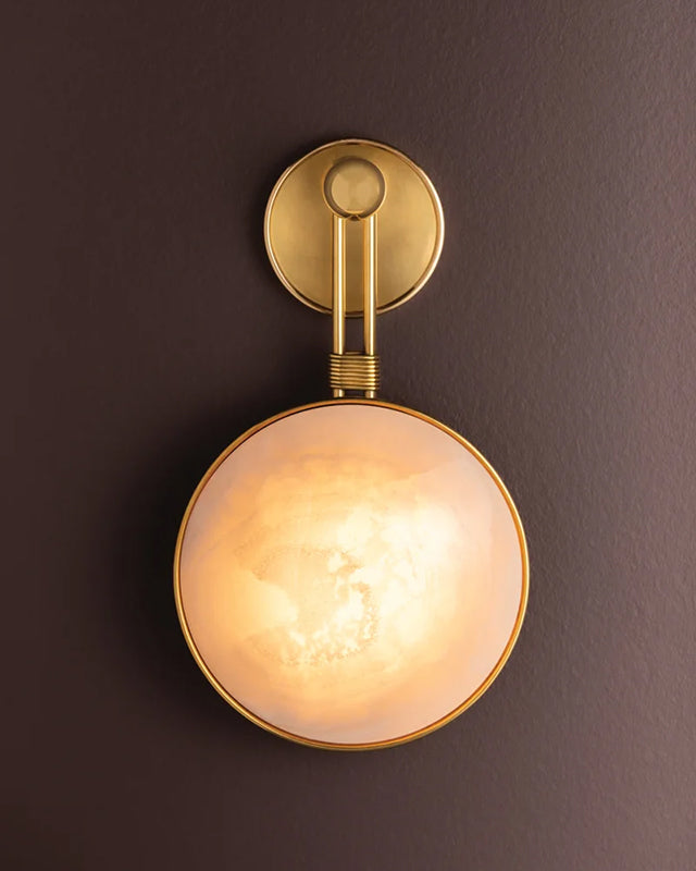 Reminiscent of a dangling jewelry charm, Ares lends an otherworldly beauty to modern interiors. When illuminated, the central LED-lit ice onyx lens glows with a mesmerizing mother-of-pearl-like iridescence. Subtle details, from the stone finial detail to the ribbed metalwork, contribute to the artisanal feel of this wall light.