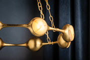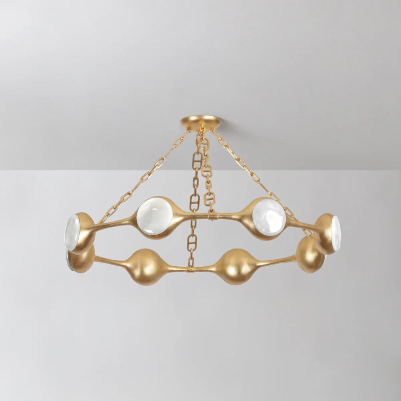 Inspired by Noz Nozawa’s stackable rings, Riviere features a classic silhouette accented by striking details and powered by energy-efficient LED. Organic, pod-shaped heads encase ice onyx discs within a bezel setting reminiscent of the way a gemstone is set into a ring. Finished in Vintage Gold Leaf, the distinctive chain suspending the chandelier adds another jewelry-like element to the design.