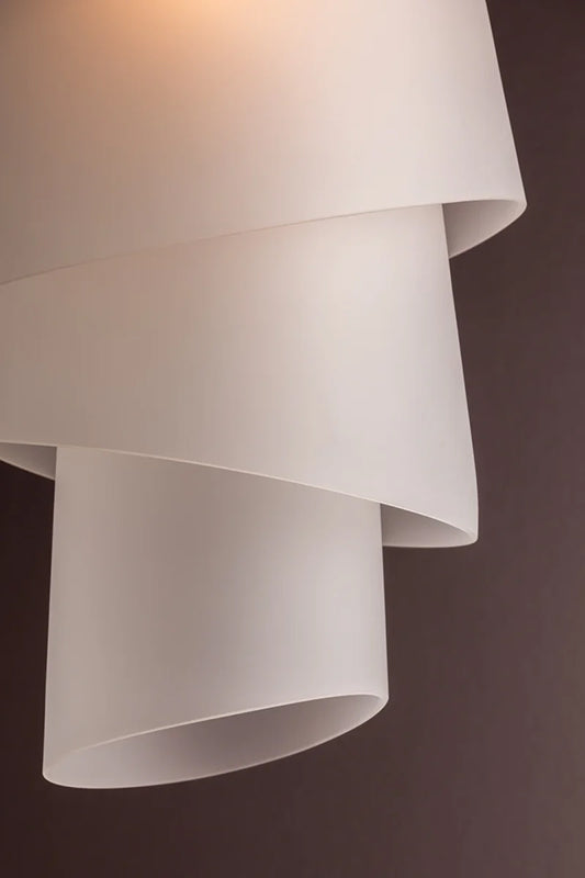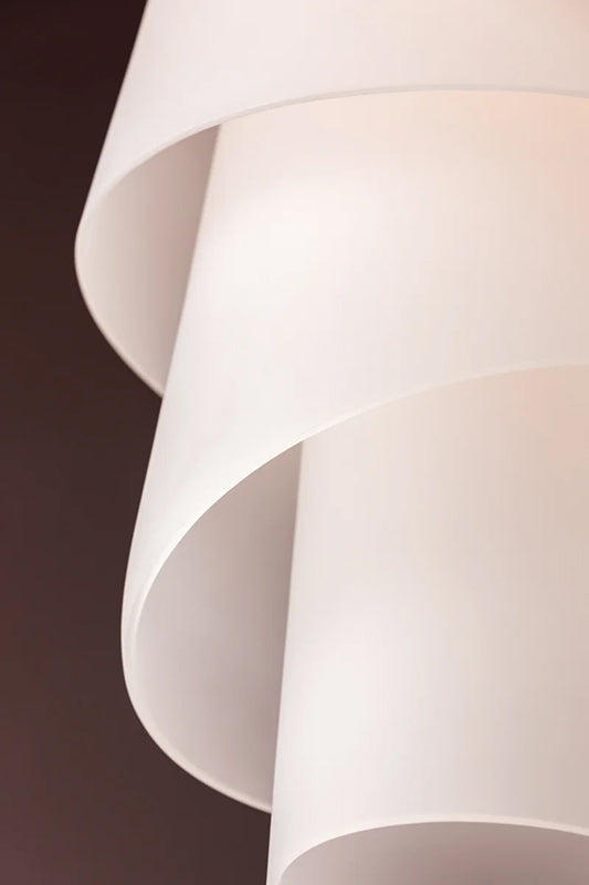 Recalling the shape of a bluebell, the Hela pendant features a three-tiered bloom crafted from etched clear glass. The bias cut on the glass ends enhances the overall fluidity of the silhouette, creating a sense of movement from every angle.