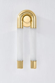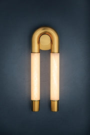 Reminiscent of a chunky, individual chain link or a beautiful modern earring, Zeme is instantly recognizable as a creation of Noz Nozawa. The simple yet exaggerated silhouette feels new and fresh yet understandable. The integrated LED light introduces a touch of innovation, while the etched cloud glass and Vintage Polished Brass finish nod to vintage glamor.