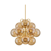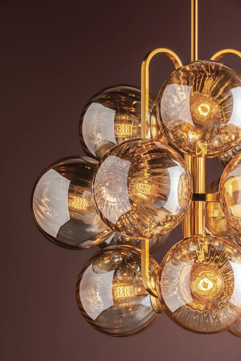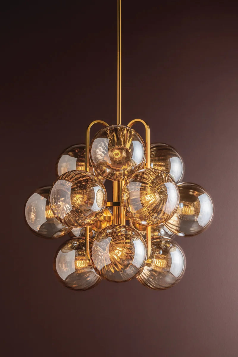Like grapes on a vine, a cluster of glass orbs perch along the antique-inspired frame of Cronus. The ribbed, light bronze glass emits a warm glow, complemented by gleaming Vintage Polished Brass arches.
