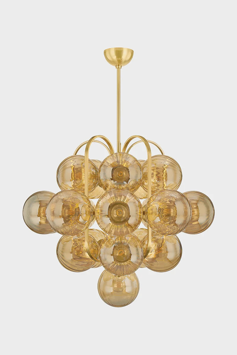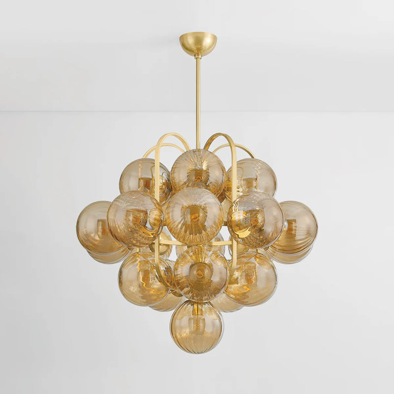 Like grapes on a vine, a cluster of glass orbs perch along the antique-inspired frame of Cronus. The ribbed, light bronze glass emits a warm glow, complemented by gleaming Vintage Polished Brass arches.