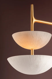 Combining straight lines and curved forms, Evander is all about balance. The stacked, gesso white bowls are filled with light, reflecting upon each other to create a tranquil glow. Organic shaping in the connection points softens the overall impression of the slender framework.