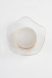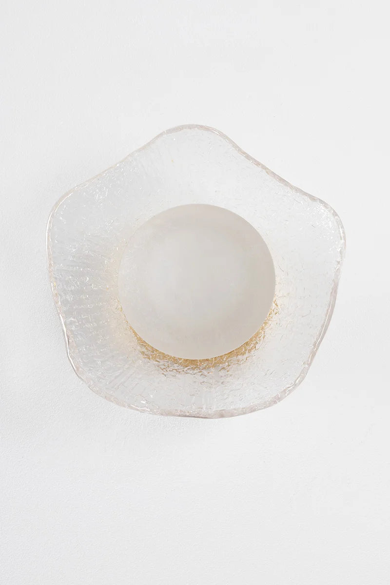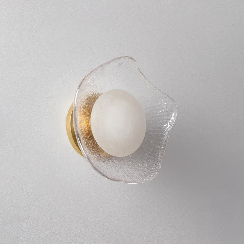 Combining organic and modern elements, Almandine is an elevated take on a traditional ring chandelier. The minimalist frame is accented with floral-shaped shades hand-cut from fluted piastre glass. Finished in Vintage Gold Leaf, the restrained metalwork allows the beauty of the blooms to shine.