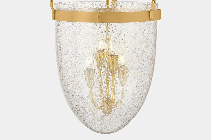 The clean lines, delicate chains, and statement drop shade of Angus offer a contemporary take on a lantern silhouette. The Mica glass shade is characterized by unique bubbles that give the surface a watery appearance.