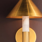 Towing the line between traditional and contemporary styling, Altona makes a restrained, luxe statement. The traditional torch silhouette allows the distinctive mix of materials to shine in this versatile sconce. Juxtaposed with natural alabaster, the vertically fluted Vintage Brass detailing and matching shade results in varying light effects.