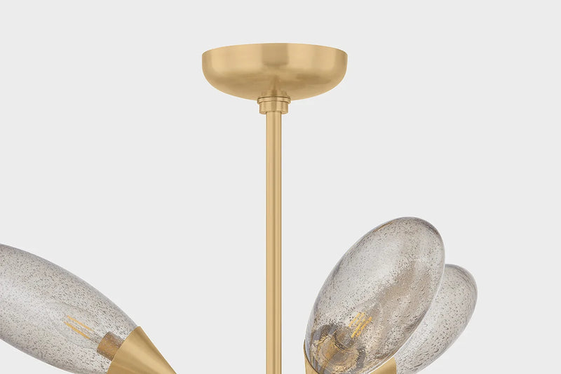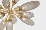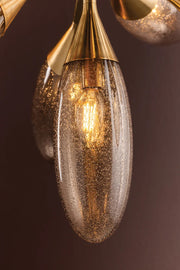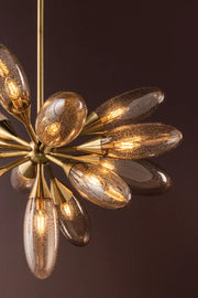 Organic forms and surprising geometry come together in the bold Sputnik-inspired design of Cordoba. This family of fixtures features an array of seedy light bronze glass shades that are light yet voluminous; organic yet refined. The Vintage Brass finish on the frame gives Cordoba a retro flair, while the futuristic shape of the glass shades adds a contemporary edge.