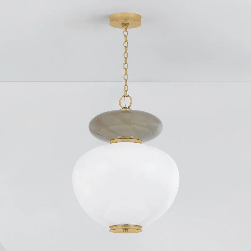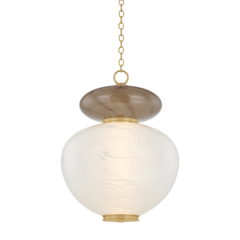 The organically-shaped Syros pendant is designed to be symmetric enough for use in multiples, while still feeling ornamental and elevated. It features a large Remolino Blanco glass shade topped by a smaller affogato glass shade. The sculptural stacked design is brought to life by the sense of movement in the specialty glass, accented by polished Vintage Brass metalwork.