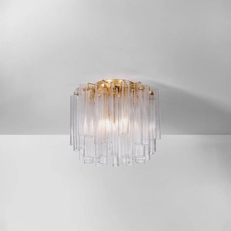 Mesmerizing Piastra glass tubes are layered in tiers to create the grand vision of Varenna. A soft, organic reimagining of an Art Deco silhouette, this flush mount comes in three sizes to create focal points in different-sized spaces. The sculpted waves in the specialty glass evoke an ethereal sense of movement while allowing for a more dynamic light diffusion. The close-to-ceiling canopy frames the fixture like a halo, finished in Vintage Gold Leaf.