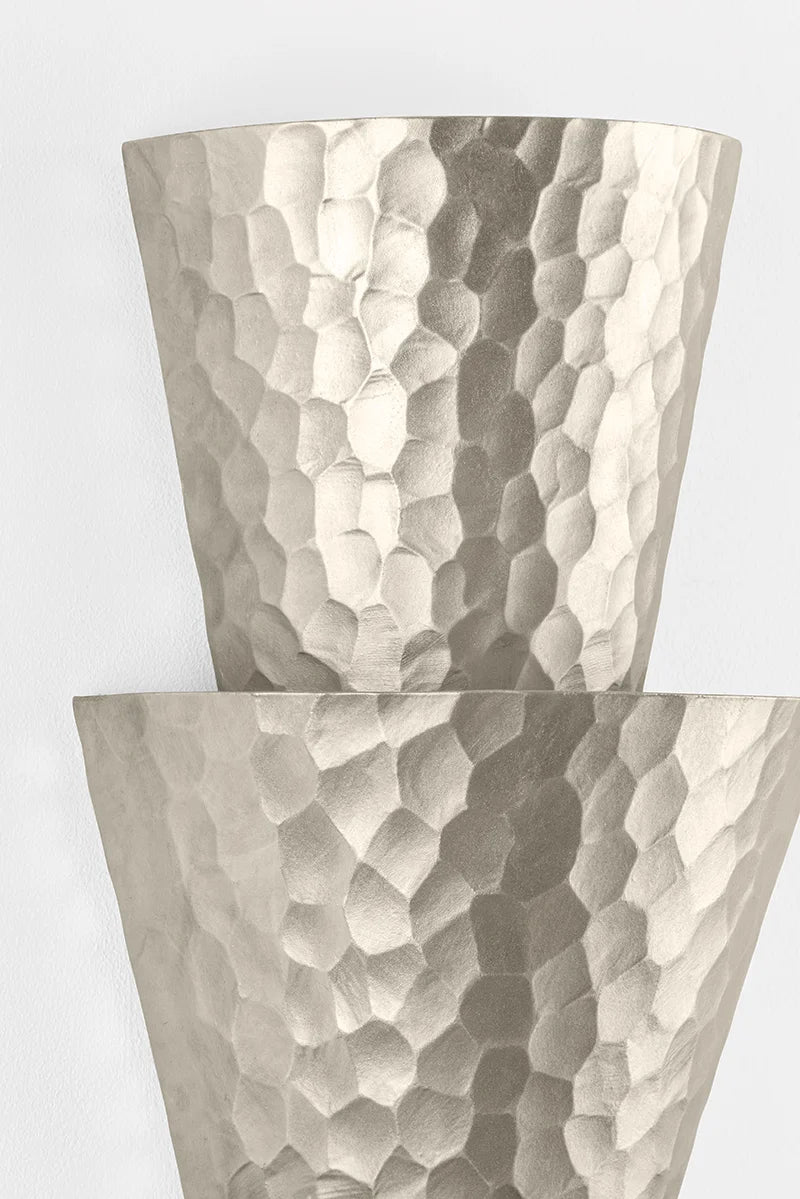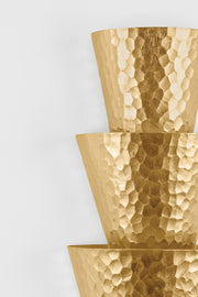 The petite scale of the Bucharest sconce does nothing to diminish its impact. The artful, rhythmic design features a stack of three conical half-shades that create a dramatic, ambient wash of light on the wall. The shapes are complemented by the exquisite finish options of Hammered Vintage Gold Leaf or Warm Silver Leaf, adding texture that highlights the masterful craftsmanship of this unique sconce.