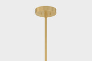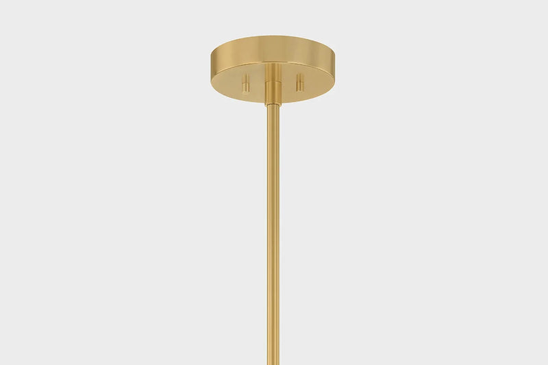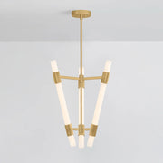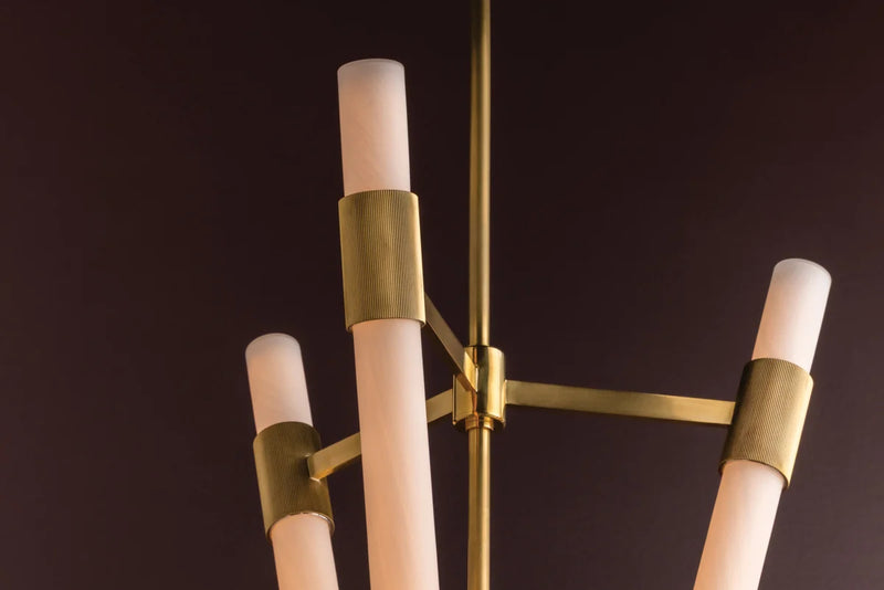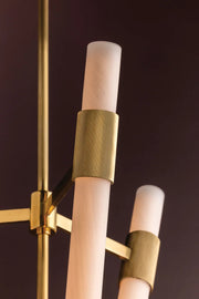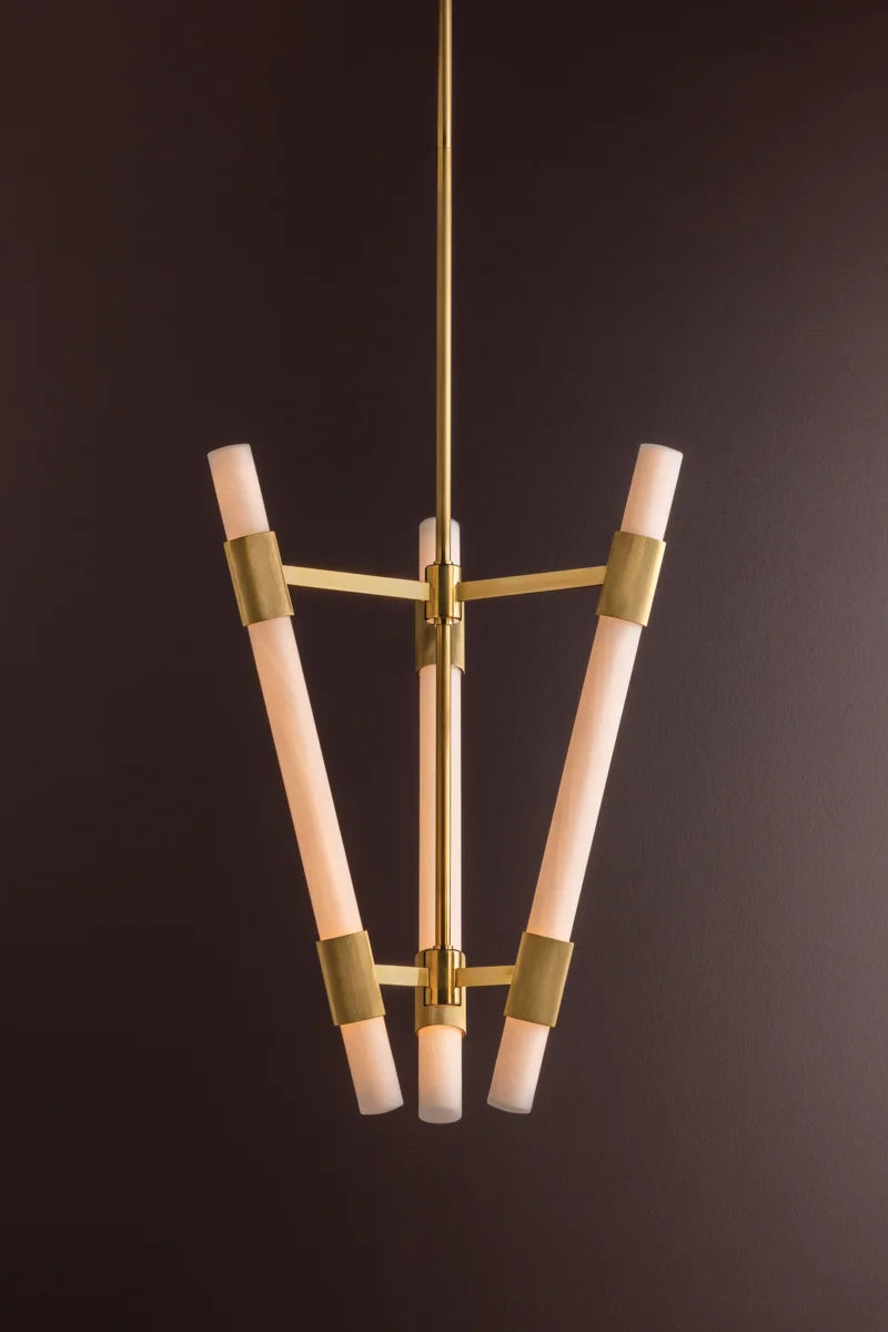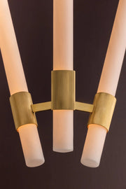 The futuristic design of Krakow uses minimalist forms to create a maximalist statement. Simple matte cloud glass tubes are illuminated by LED, providing bright overhead lighting without a harsh glare. Warm Vintage Brass cuffs with ribbed detailing support the shades, which tilt away from the frame to disperse light and create a striking visual impression from below.