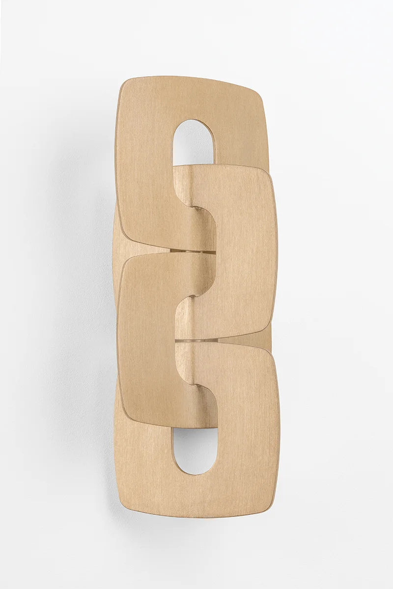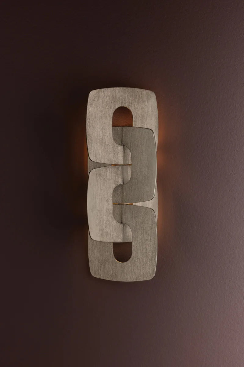 The Trentino sconce takes inspiration from a classic jewelry chain, magnifying the scale to produce a bold, modern lighting statement. Sculptural, yet simple, the geometric silhouette conceals the light source, which washes the wall with a warm glow.
