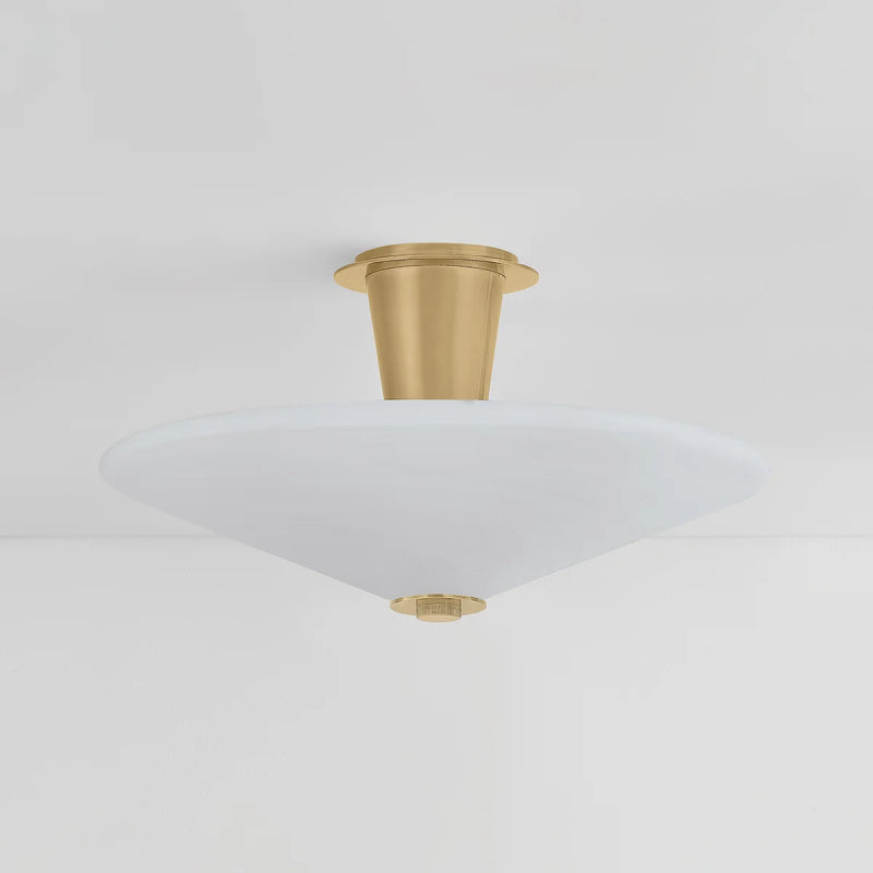 Modern and sophisticated, the Cologne semi-flush mount features sleek metalwork and wide tapered cloud glass shades. Finished in Vintage Brass, the frame complements and supports the disc-like shape of the shades without detracting from them.