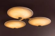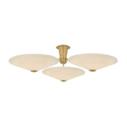 Modern and sophisticated, the Cologne semi-flush mount features sleek metalwork and wide tapered cloud glass shades. Finished in Vintage Brass, the frame complements and supports the disc-like shape of the shades without detracting from them.