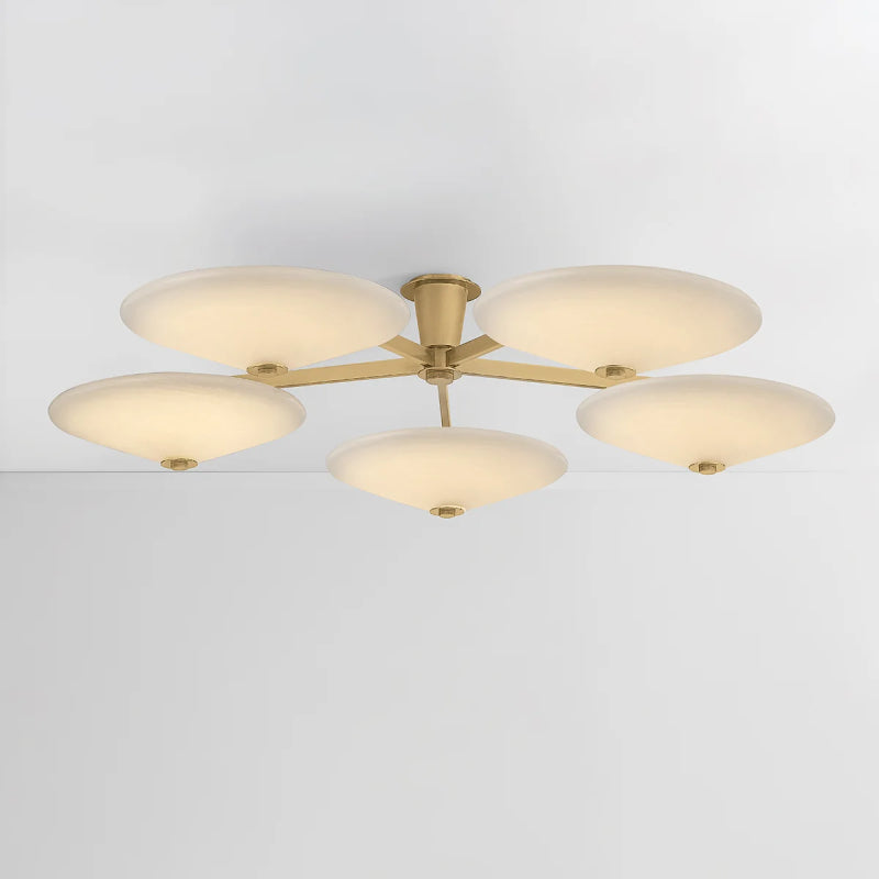 Modern and sophisticated, the Cologne semi-flush mount features sleek metalwork and wide tapered cloud glass shades. Finished in Vintage Brass, the frame complements and supports the disc-like shape of the shades without detracting from them.
