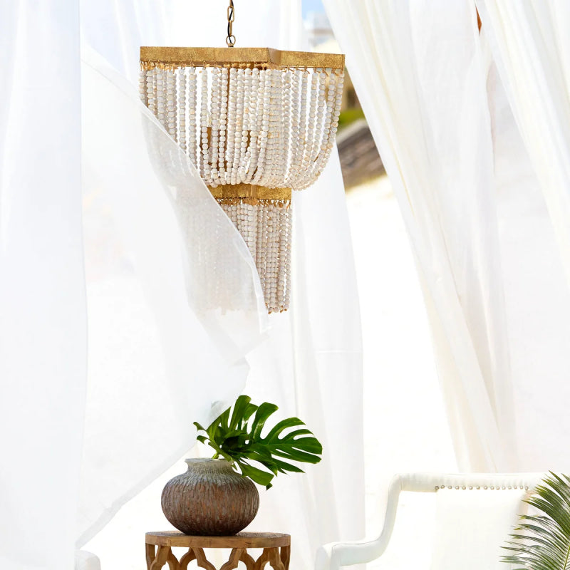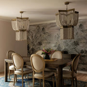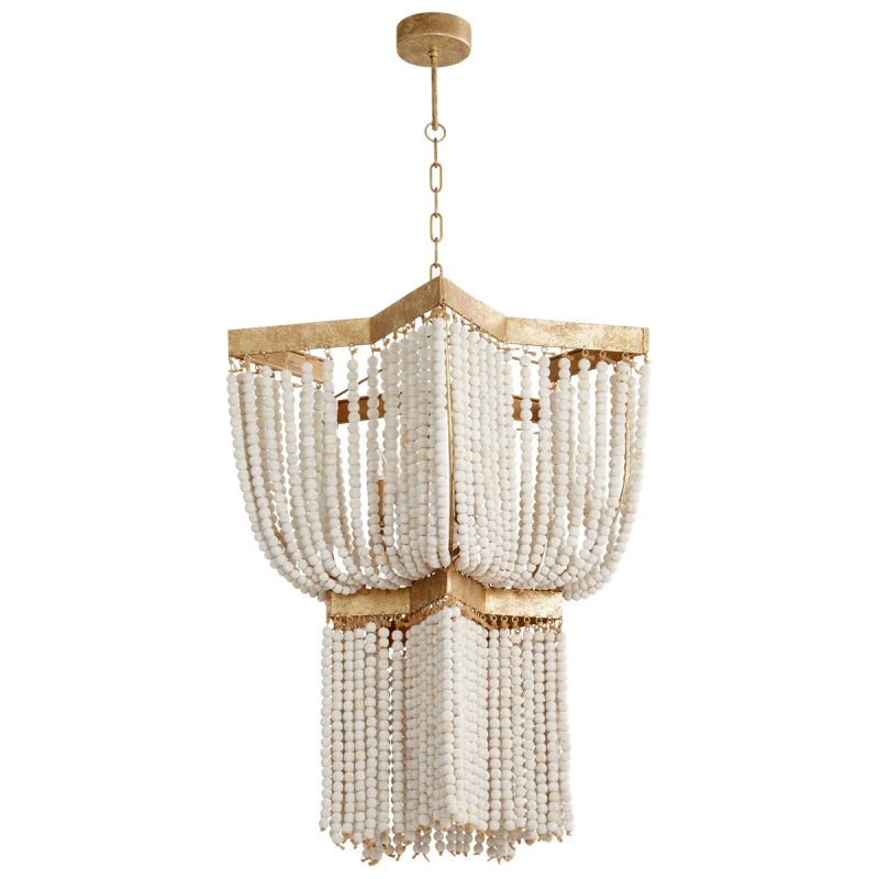 The elegant Estrella Pendant possesses a natural contrast between its gilded two-piece frame and the dark monochromatic beads that make up its impermanent body. The Estrella Pendant is perfect for any formal space.
