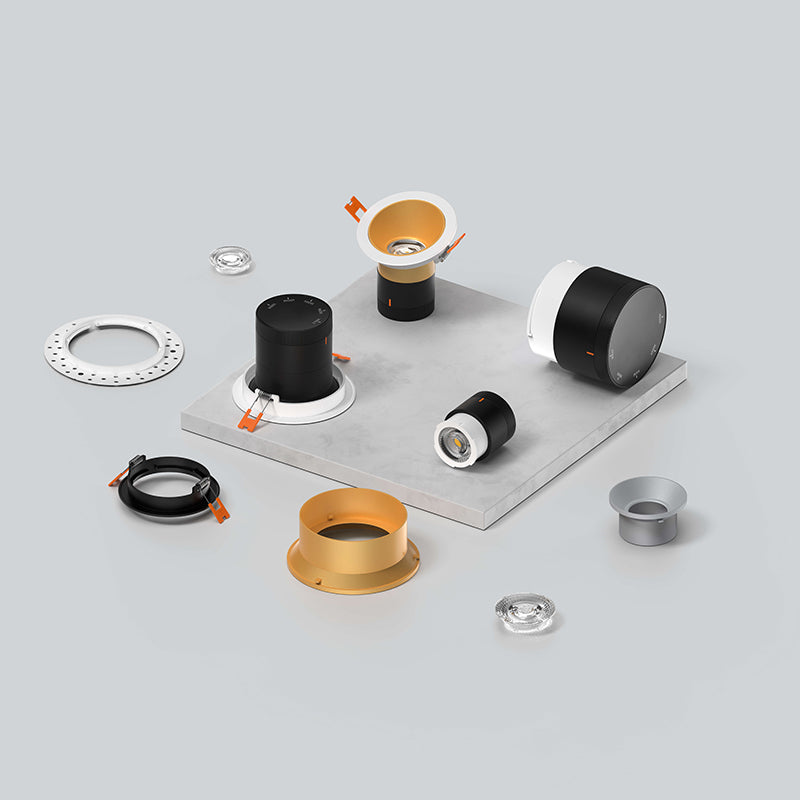 A versatile recessed lighting solution featuring customizable finishes, trims, lenses, and reflectors, with options for standard, sloped ceiling, and trimless installations, all with multi-voltage compatibility.