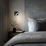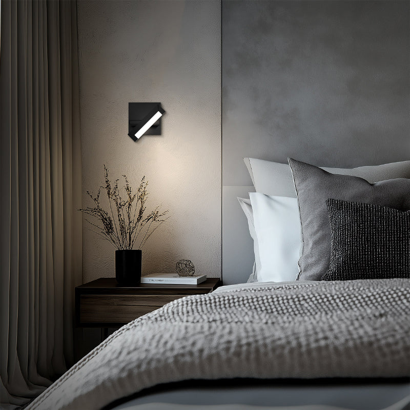 A shelf-like arm rotates as desired, delivering ample down lighting or angled spots of light from the adjustable shade.