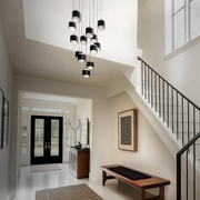 A lustrous metallic band encircles an inner white diffuser, creating an elegant play of shadow and glowing illumination. Multiple Banded pendants are installed on a round canopy to make a modern statement in any space.