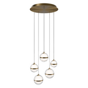 A translucent glass sphere divided by a single metallic band captures a clean, modern aesthetic. Multiple pendants are installed on a square canopy to make a impressive visual statement in any space.