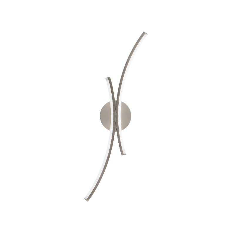 Deconstructed. Offset curves lined with soft LED illumination are mounted on a round backplate, creating a strong visual presence in modern rooms.