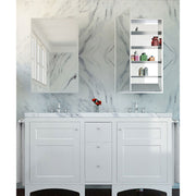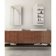Simplicity in both form and function can easily accentuate any design style you choose. It features exceptional reflectivity, glass shelving, and conveniently placed integrated outlets.