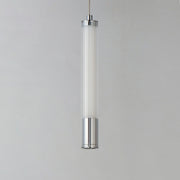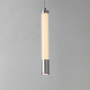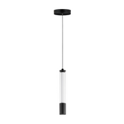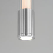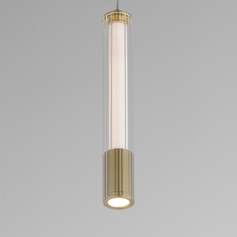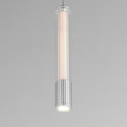 A central, cylinder diffuser of opal white acrylic diffuses LED lighting within a cavity of thin ribbed glass of various lengths. Both imaginative and functional, the bright pendants encase an additional down light recessed within a Polished Chrome, Naturally Aged Brass or Matte Black housing casting light downward.