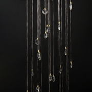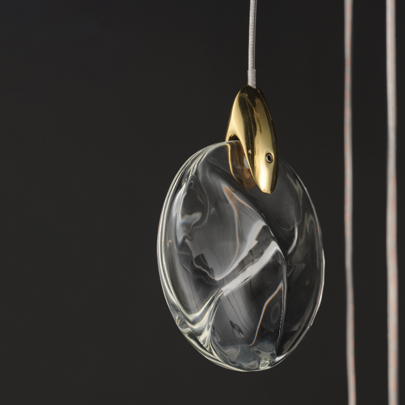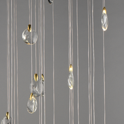 As if naturally formed from the ebbing shores of a riverbed, smooth and irregularly shaped crystal pebbles are suspended by cast metal clasps in a Polished Gold finish. Discreetly illuminated by concealed LED light sources within the clasps, additional downlight originates from LED GU10 lamps housed in a Matte Black canopy adding to the refracting iridescent shimmer on the crystal surface below.