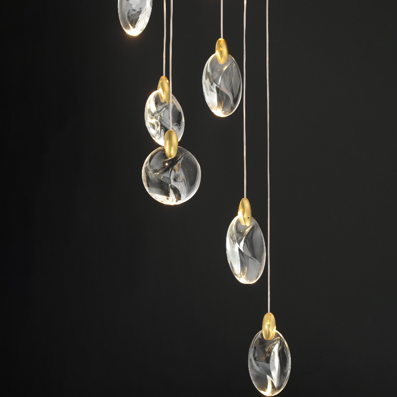 As if naturally formed from the ebbing shores of a riverbed, smooth and irregularly shaped crystal pebbles are suspended by cast metal clasps in a Polished Gold finish. Discreetly illuminated by concealed LED light sources within the clasps, additional downlight originates from LED GU10 lamps housed in a Matte Black canopy adding to the refracting iridescent shimmer on the crystal surface below.