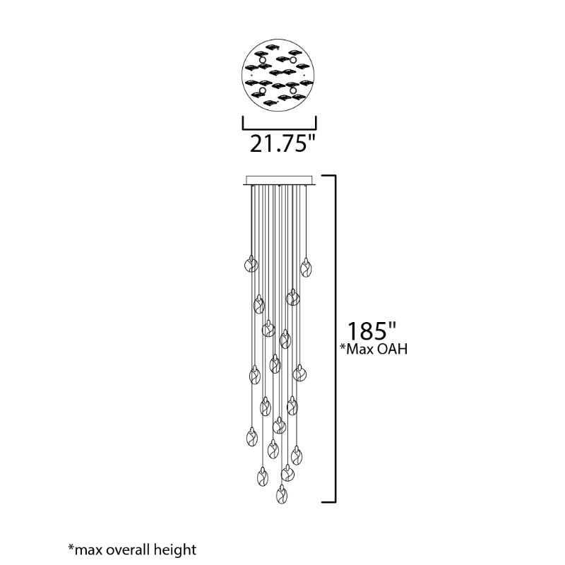 As if naturally formed from the ebbing shores of a riverbed, smooth and irregularly shaped crystal pebbles are suspended by cast metal clasps in a Polished Gold finish. Discreetly illuminated by concealed LED light sources within the clasps, additional downlight originates from LED GU10 lamps housed in a Matte Black canopy adding to the refracting iridescent shimmer on the crystal surface below.