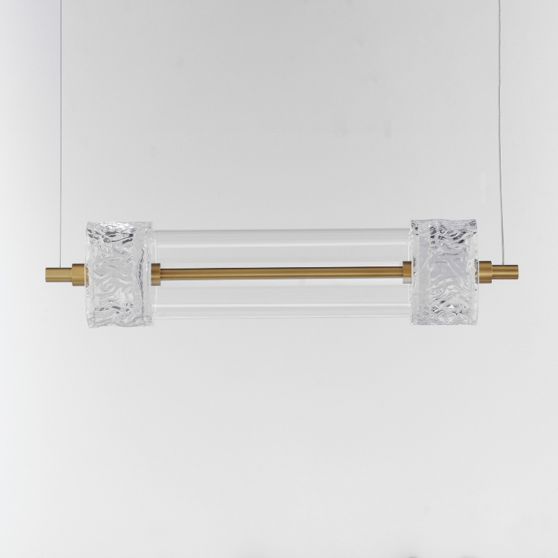 Segments of Clear glass cylinders are separated by distinctly rippled Clear crystal fonts on a thin Natural Aged Brass frame. The translucent segments are backlit with integrated LED illumination creating an airy, ethereal composition of glass textures.