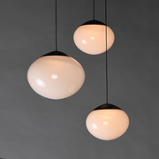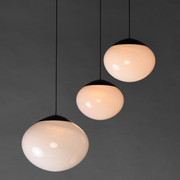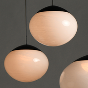 Oblong glass globe shades feature a intriguing Marble swirl pattern that obscures the integrated LED lighting within. Thin black electrical cords are easily adjustable. A larger oval 8-Light configuration features multiple sizes of the glass to create an interpretative congregation of clouds.