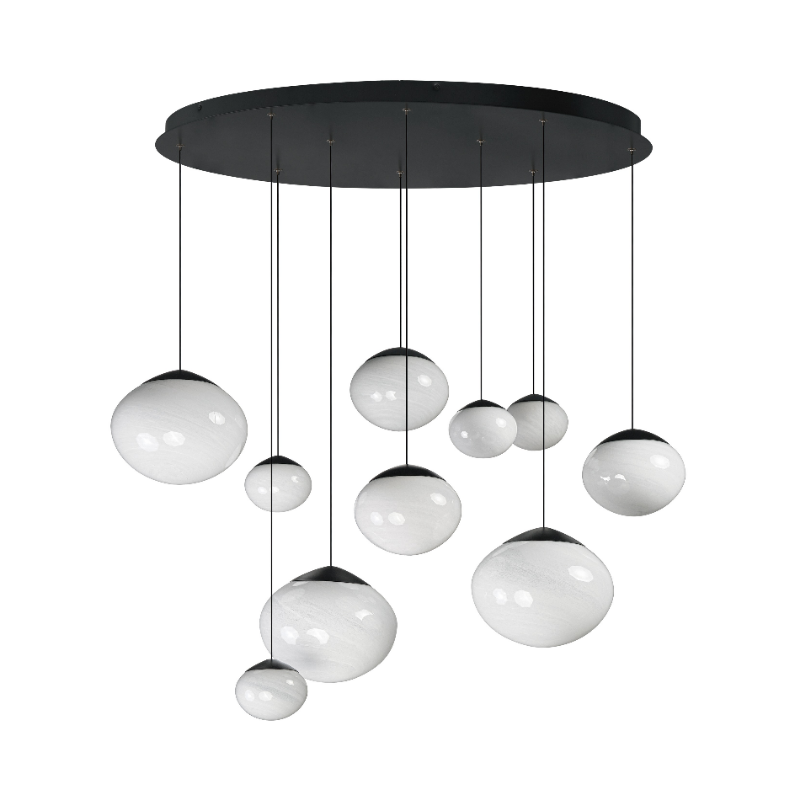 Oblong glass globe shades feature a intriguing Marble swirl pattern that obscures the integrated LED lighting within. Thin black electrical cords are easily adjustable. A larger oval 8-Light configuration features multiple sizes of the glass to create an interpretative congregation of clouds.