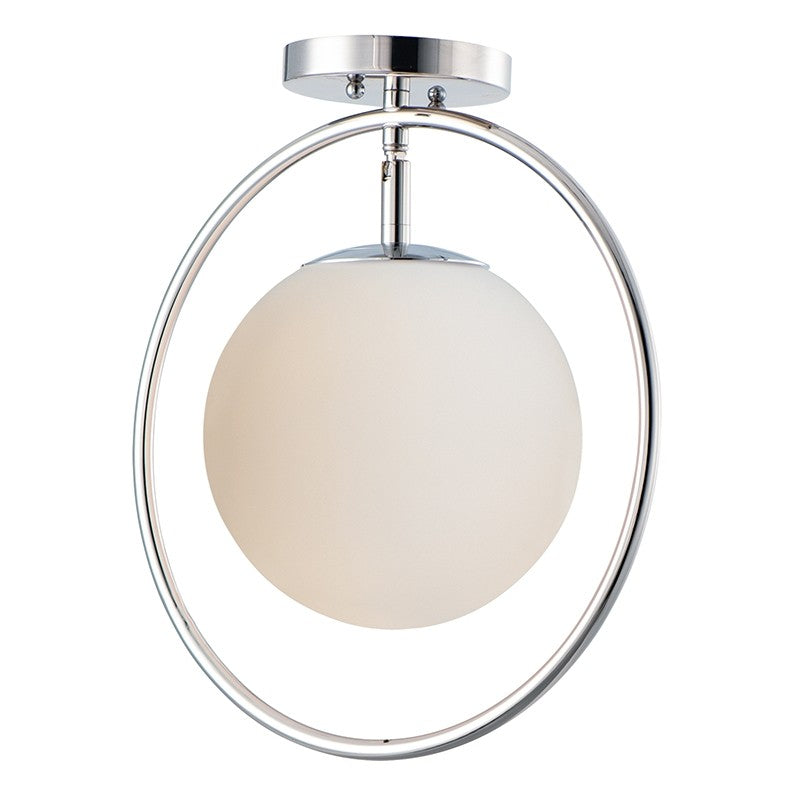 Hoops of Polished Nickel surround glass balls of Satin White to create this crisp and clean modern design. This current design trend compliments both modern and transitional aesthetics.
