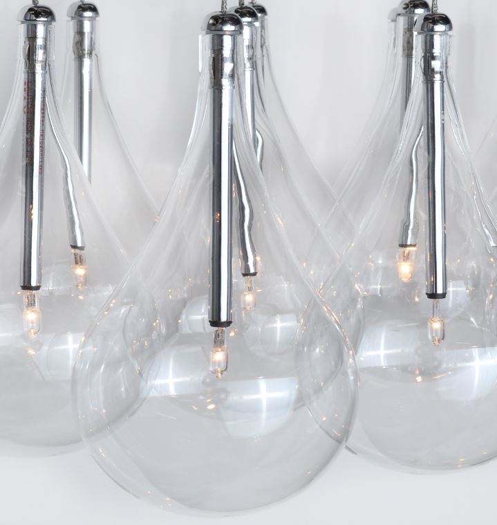A simple idea gracefully executed in the Larmes collection. Row upon row of Clear oversized teardrops, mounted onto an extended Polished Chrome lamp holder that supports xenon lamps sets the stage. Individually adjustable drops for custom stagger effects allow for dramatic impact. An added benefit of each drop being aircraft cable-suspended, is the ability to adjust the overall height of the piece to fit the space. The overall result is stark and stunning.