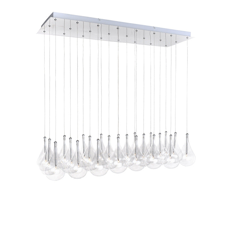 A simple idea gracefully executed in the Larmes collection. Row upon row of Clear oversized teardrops, mounted onto an extended Polished Chrome lamp holder that supports xenon lamps, sets the stage. Individually adjustable drops for custom stagger effects allow for dramatic impact.