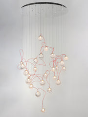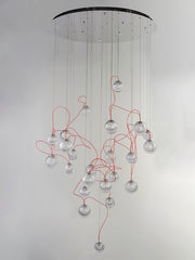 Numerous spheres of heavy Bubble Glass are suspended in an avant-garde fashion connected at various points with a contrasting red cord that creates an artistic impression of light. The Polished Chrome canopy reflects light from the integrated LED in a galaxy-like fashion.