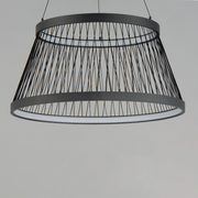 Cross-threaded strands of cotton are strung through two Matte Black illuminated rings of LED. The black cotton thread creates a form both structural and airy in composition. These pendants perfectly capture the art of weaving techniques by producing a large truncated cone of with the use of minimal material.