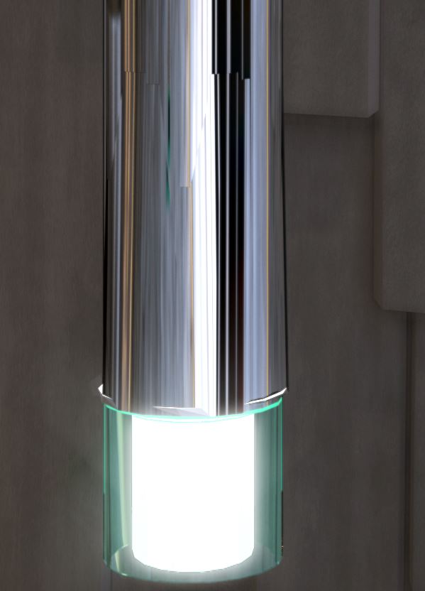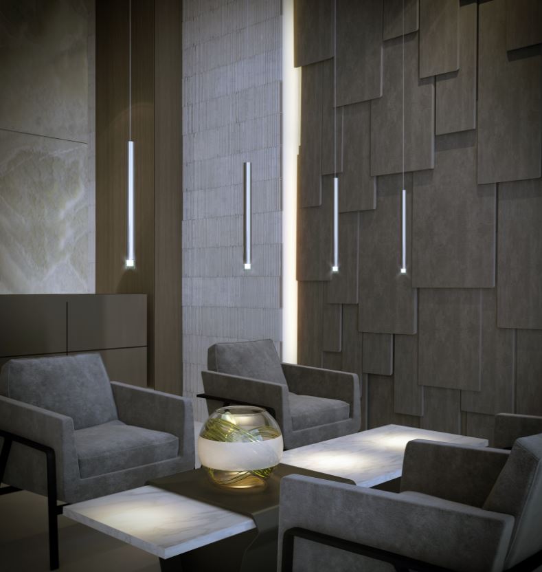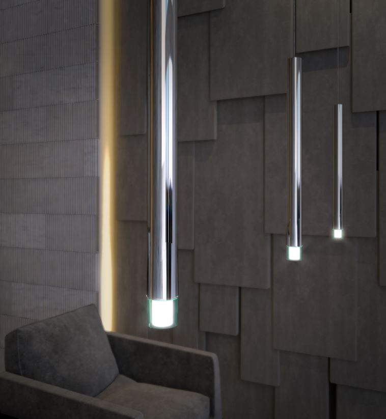 Tall-scale tubular shades of Polished Chrome are draped in a choice of unique configurations.