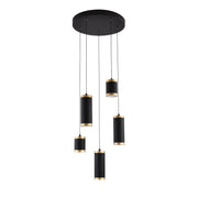 Varied lengths of Matte Black cylinders feature a cuffed edge in Gold and suspend on thin black wire. Available in multiple configurations, this integrated LED pendant collection provides an attractive design for economical pricing.