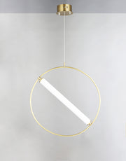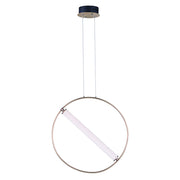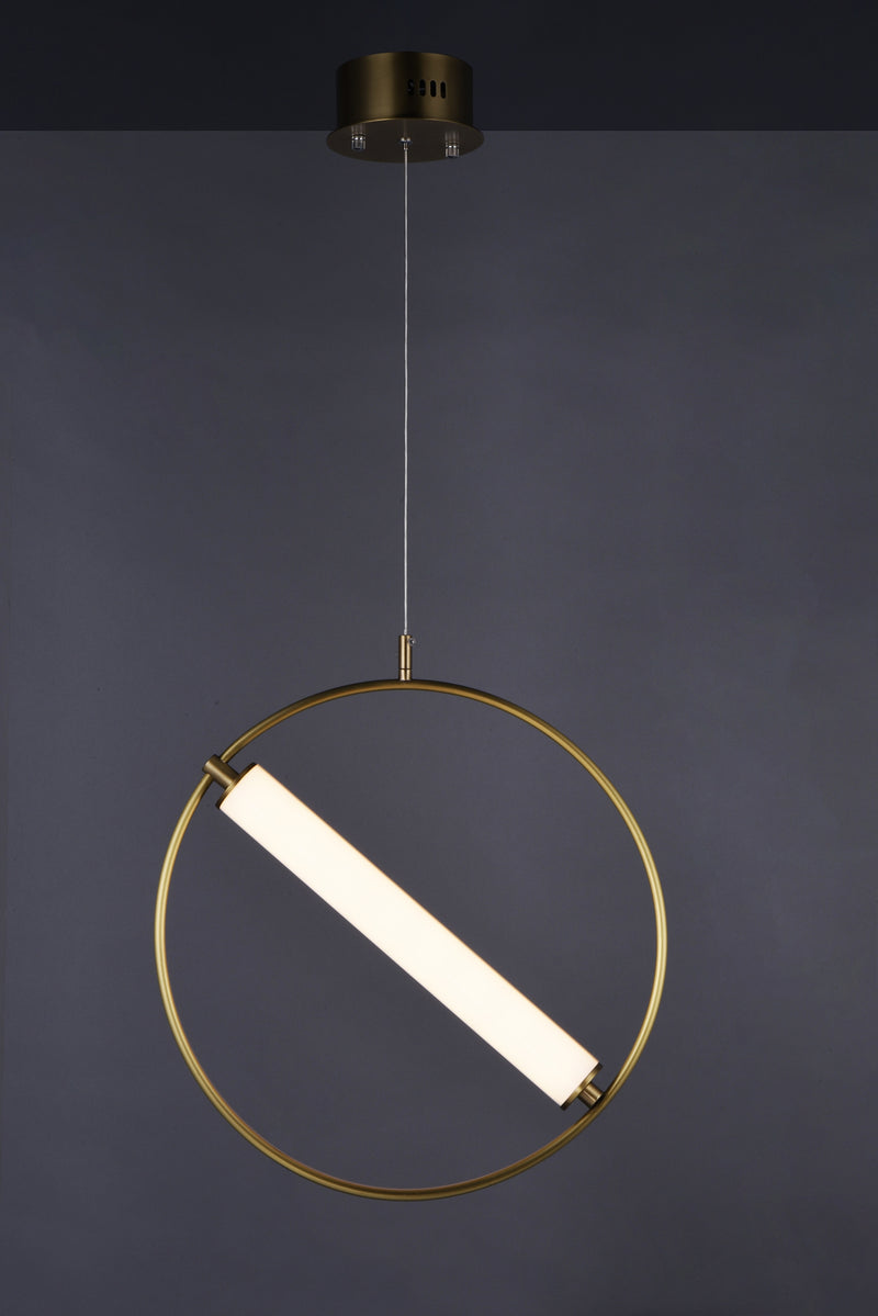 A ring suspends a tube of LED light evenly diffused through opal white acrylic. A striking combination of soft gold and black bring boldness to the collection. By adjusting the rings on the chandeliers, the light element can be positioned horizontally or at an angle.