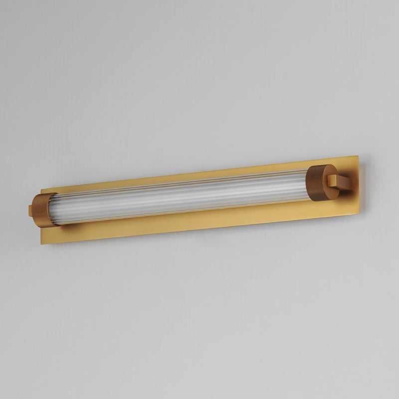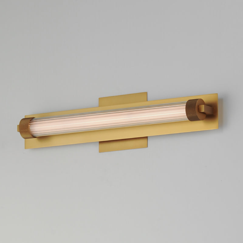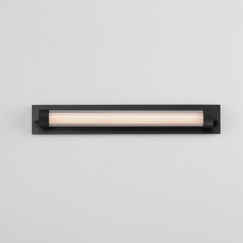 Clear ribbed glass encases a tube of opal white acrylic evenly illuminated by LED. The ends of the glass shade are fitted with knurled cylinder forms that suspend the sconces from their mounting plates. Dual mounted options are available for this series allowing it to be installed on single gang junction boxes.