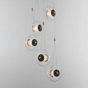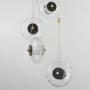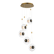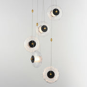 Circular bands, like ornaments, descend from thin low voltage cables in a variety of configurations. An evenly diffused LED tube spans the distance of the circular wavy glass shades creating a dazzling lighting effect.