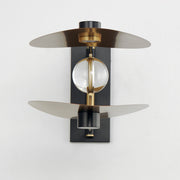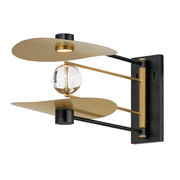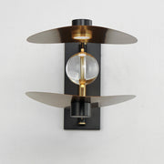 An artistic and flexible design concept, crystal orbs are illuminated behind curved Naturally Aged Brass shades. The oversized panes are mounted to LED light housings that can rotate to provide either ambient indirect lighting that is directed upwards at the crystal for a glowing effect, or these LEDs can be rotated to shine downward for ample lighting.