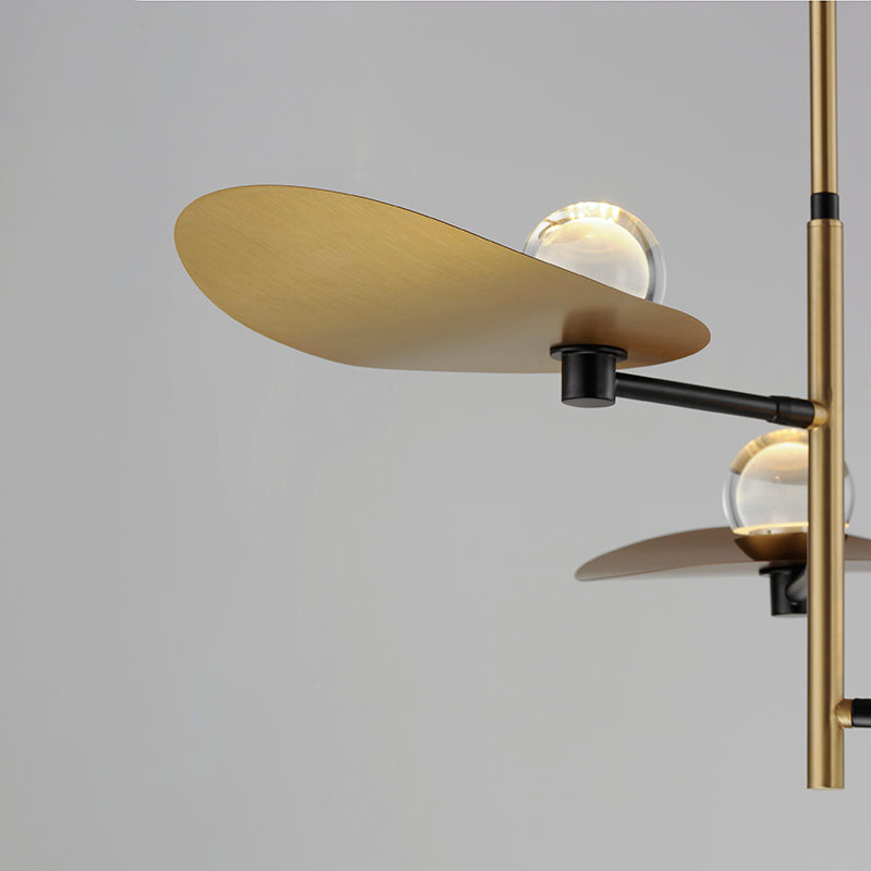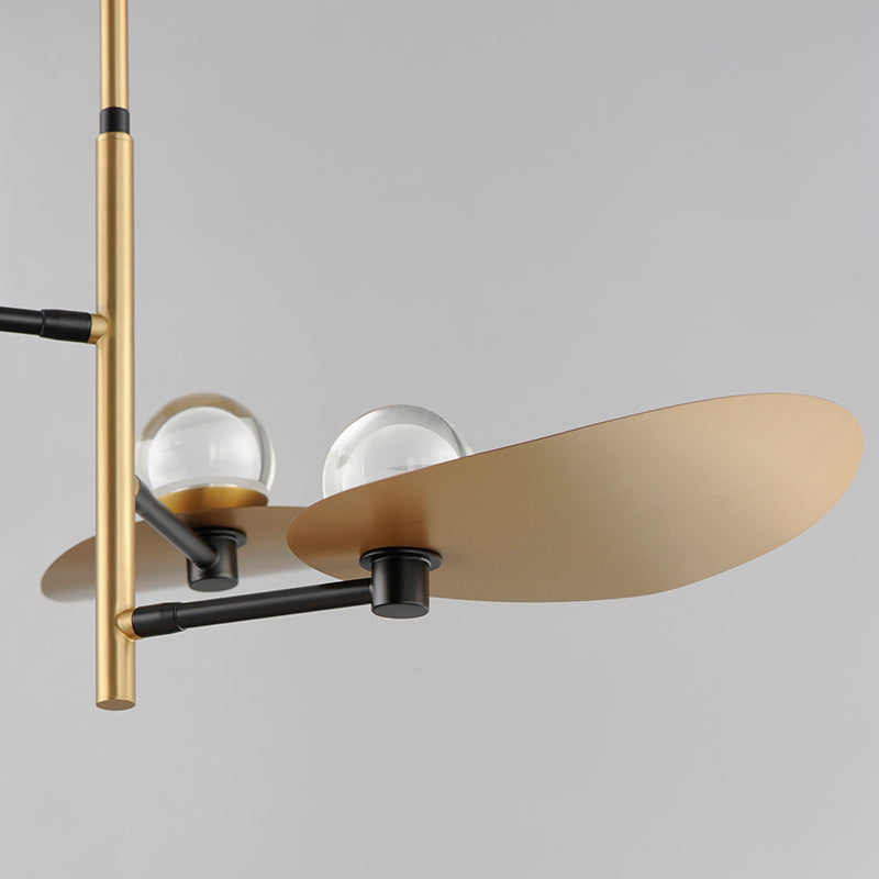 An artistic and flexible design concept, crystal orbs are illuminated behind curved Naturally Aged Brass shades. The oversized panes are mounted to LED light housings that can rotate to provide either ambient indirect lighting that is directed upwards at the crystal for a glowing effect, or these LEDs can be rotated to shine downward for ample lighting.