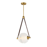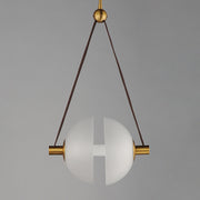 Send a message on the wire. Two semi-spherical frosted glass domes are separated by a tube of LED light and suspended by Tobacco Brown leather straps. The frames are complete in a contrasting Natural Aged Brass finish making the contemporary design softer and more applicable to traditional settings.