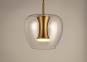 Clear apple shaped glass rest on machined aluminum fonts finished in Satin Brass with integrated LED for even Illumination without the glare. The large scale 25 light comes pre-arranged for ease of installation and is perfect for that tall ceiling application.