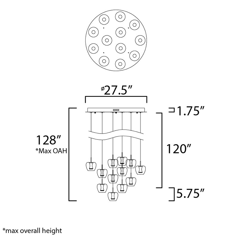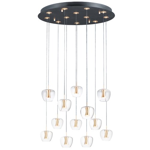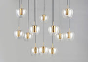 Clear apple shaped glass rest on machined aluminum fonts finished in Satin Brass with integrated LED for even Illumination without the glare. The large scale 25 light comes pre-arranged for ease of installation and is perfect for that tall ceiling application.