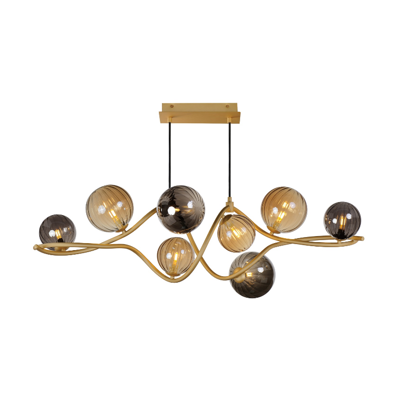 In a galaxy of light, ribbed and tinted glass is supported by swooping arcs of circular tubes. The Gold frame supports glass globe shades colored in Amber and Smoke tints that encase LED lamps provided. The single pendant has an over-sized spiraling glass shade in either Amber or Smoke, with a dome of light within and Matte Black components.
