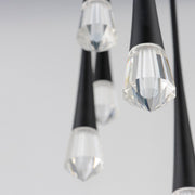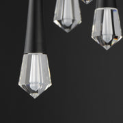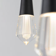 An elongated profile with piercing statement, this series of pendants feature thin black wires that support a tapered metal pendant. Recessed in this form is a high powered LED that illuminates a brilliantly faceted crystal element with etched details inside its form to capture light and enhance its beauty.